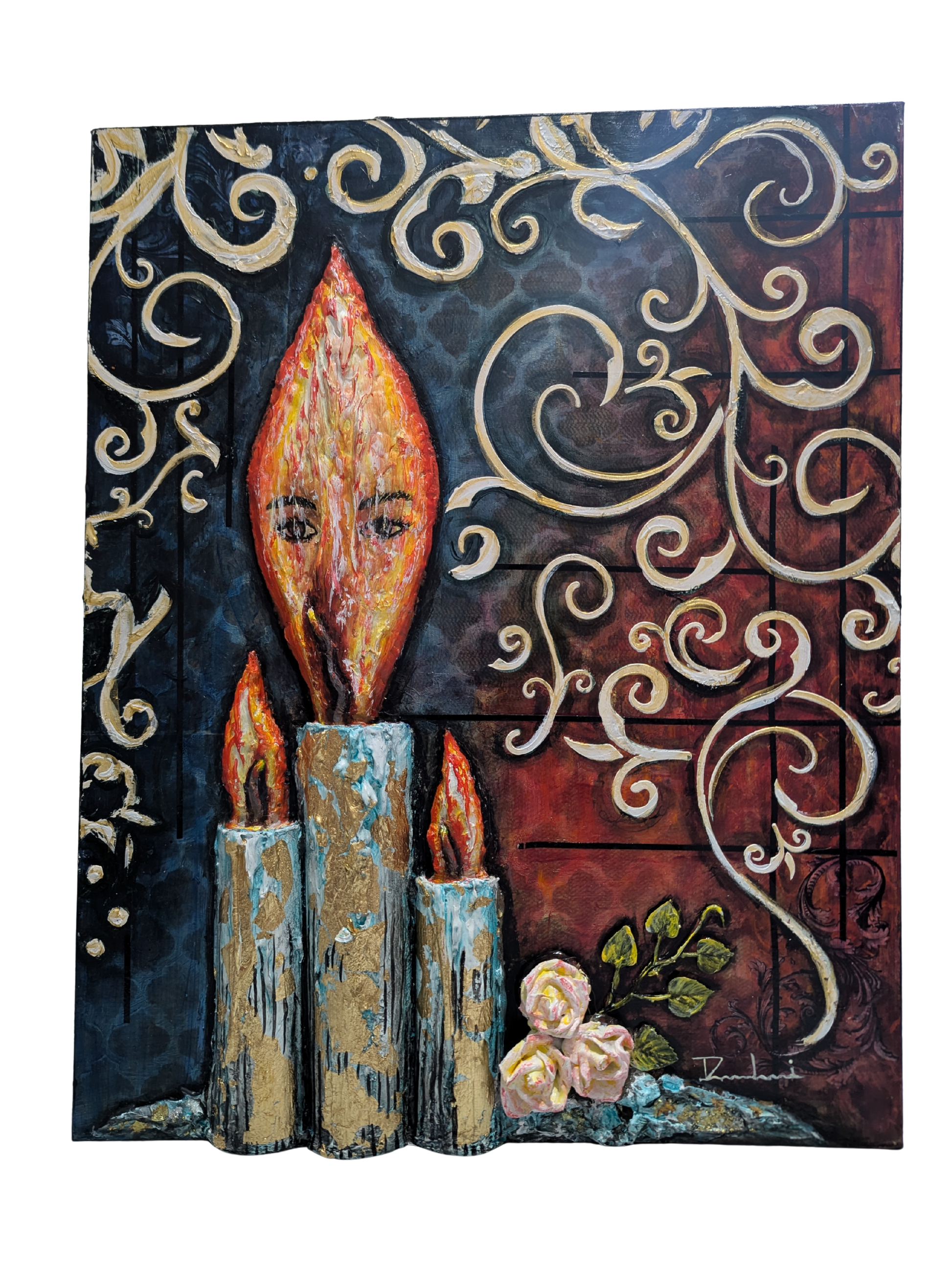 The mixed media approach allows for a tactile richness: thick, sculptural textures on the candles contrast with the fluid, ornate swirls in the background. The carved layering of paint on the roses and flames enhances the sense of depth and movement, inviting the viewer to linger and trace the story embedded in the surface.