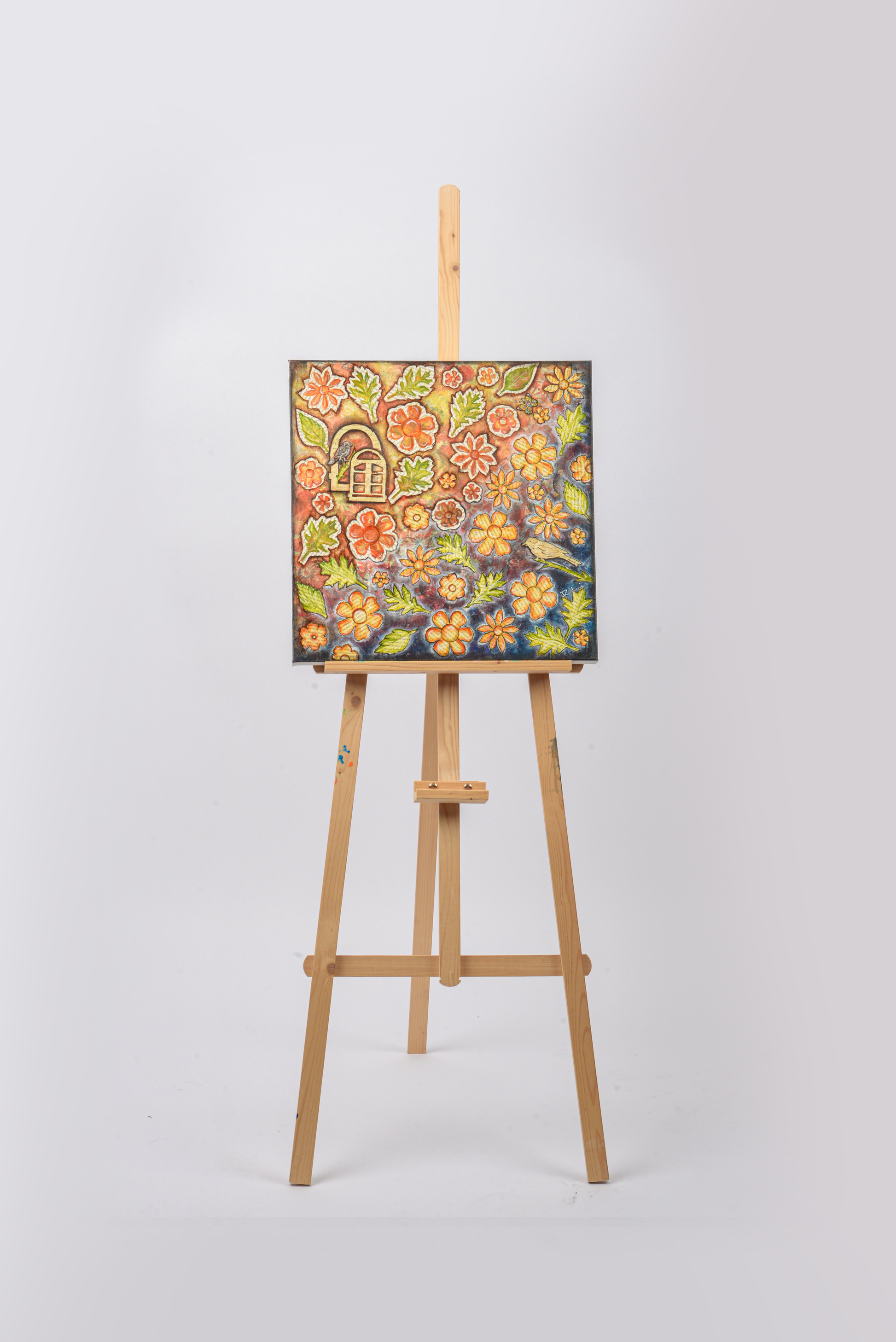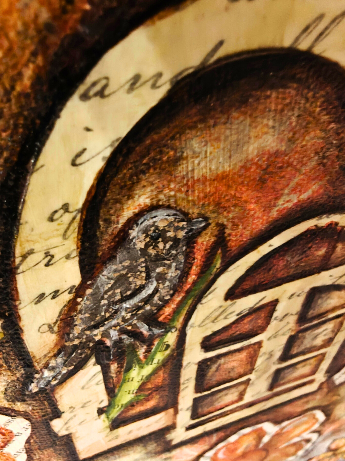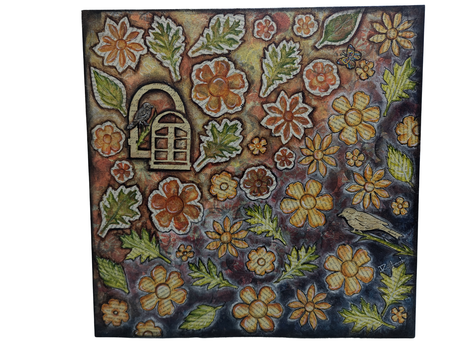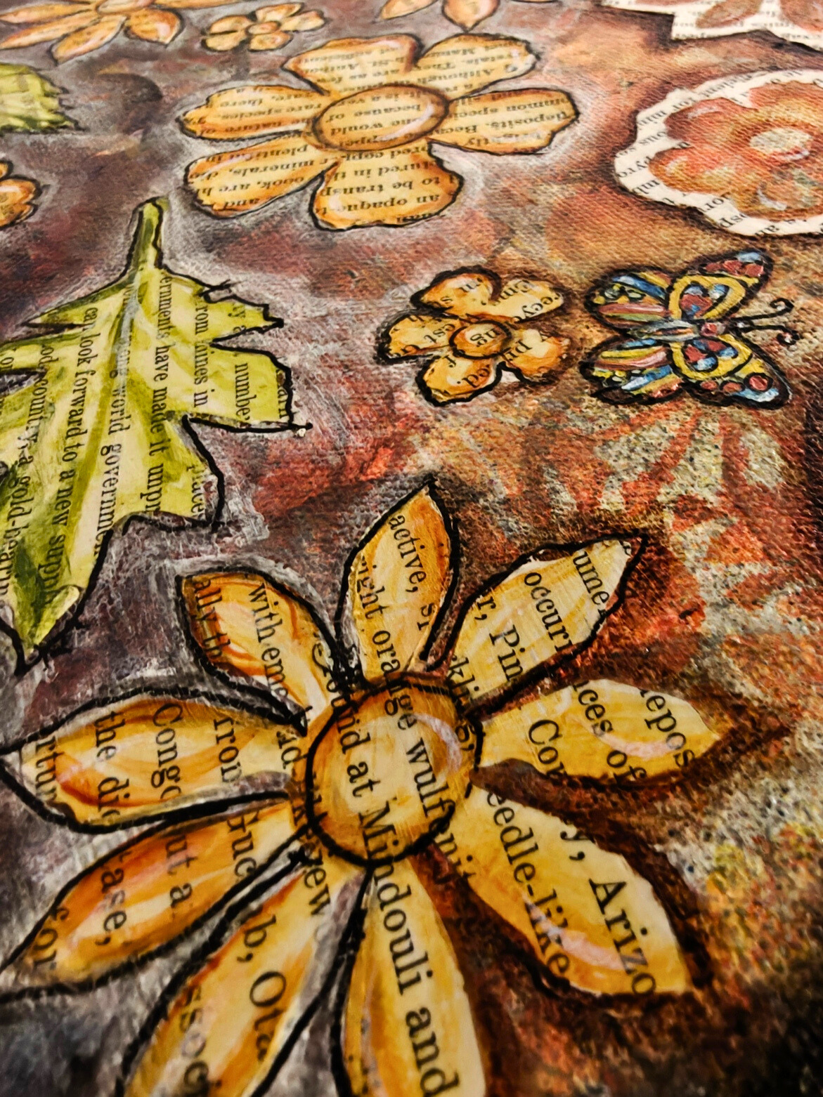 The canvas blossoms with an intricate arrangement of flowers and leaves, each formed from layered book pages and painted into vivid autumnal forms. At the left, a small window with a bird perched upon it serves as a focal point, while another bird glides across the surface. A delicate butterfly appears in the upper corner, symbolizing transformation and lightness.