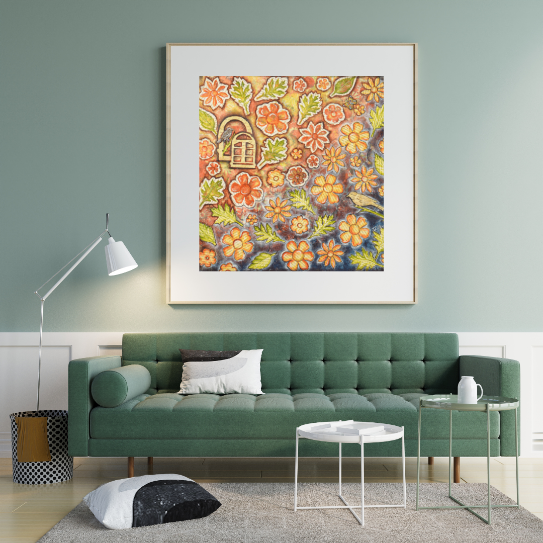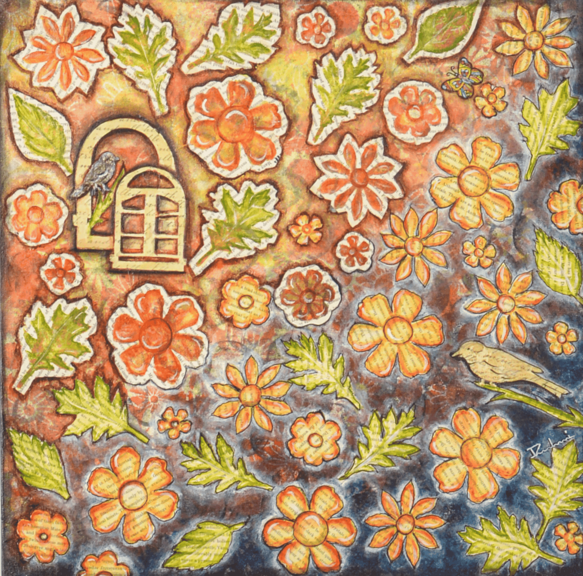 The leaves and flowers in this piece are born from printed pages, layered with texture and color to form a garden of words. The window and perched bird represent the endless possibilities that reading opens, while the bird in flight and the butterfly carry the spirit of freedom and transformation that literature brings.