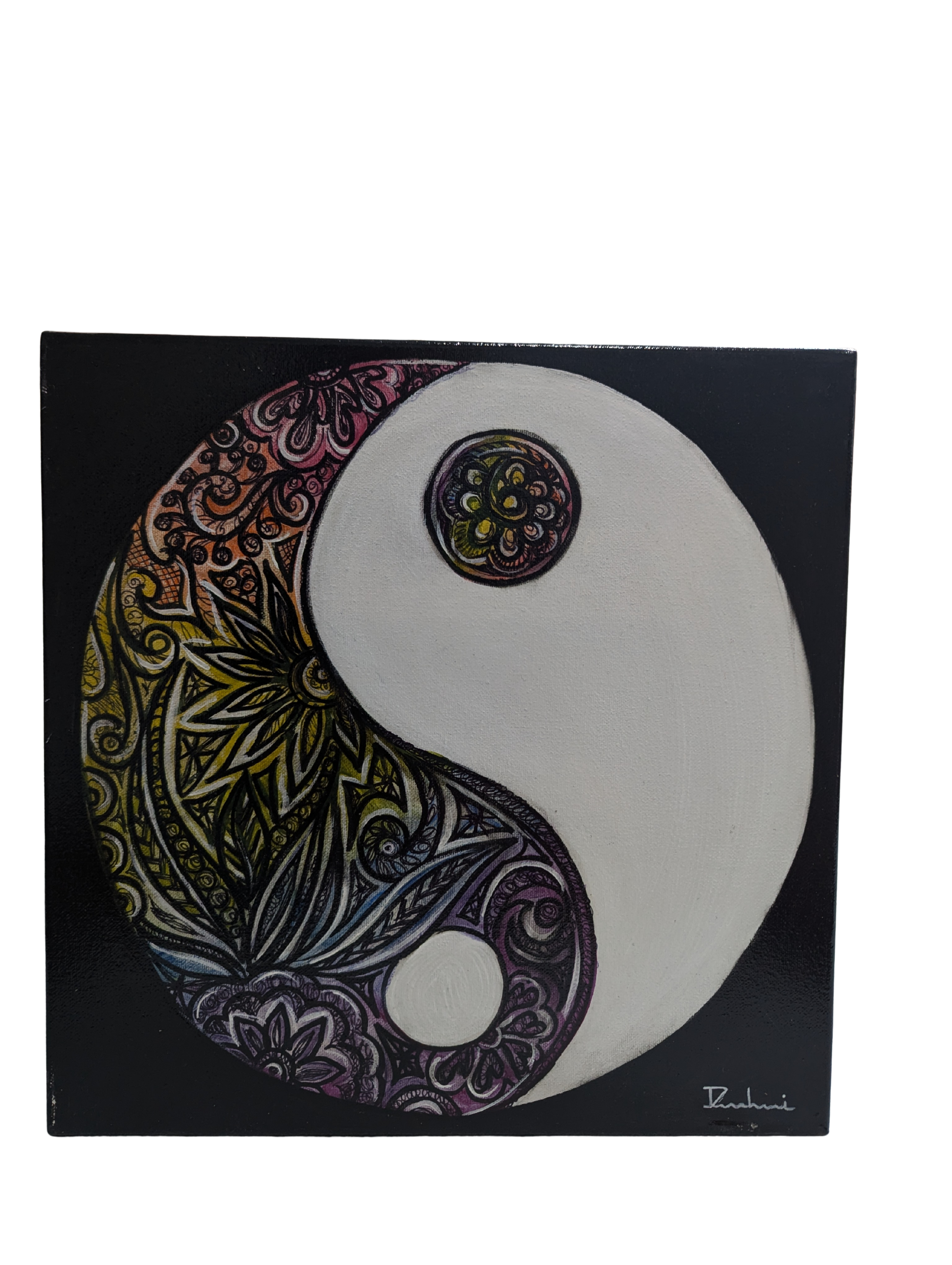 The artist fuses the fluid opacity of acrylic with the fine precision of ink, creating both depth and detail. The floral motifs, hand-rendered in delicate linework, contrast beautifully against the smooth expanses of paint. This interplay of texture underscores the central theme of complementarity — one surface alive with intricacy, the other calm in restraint.
