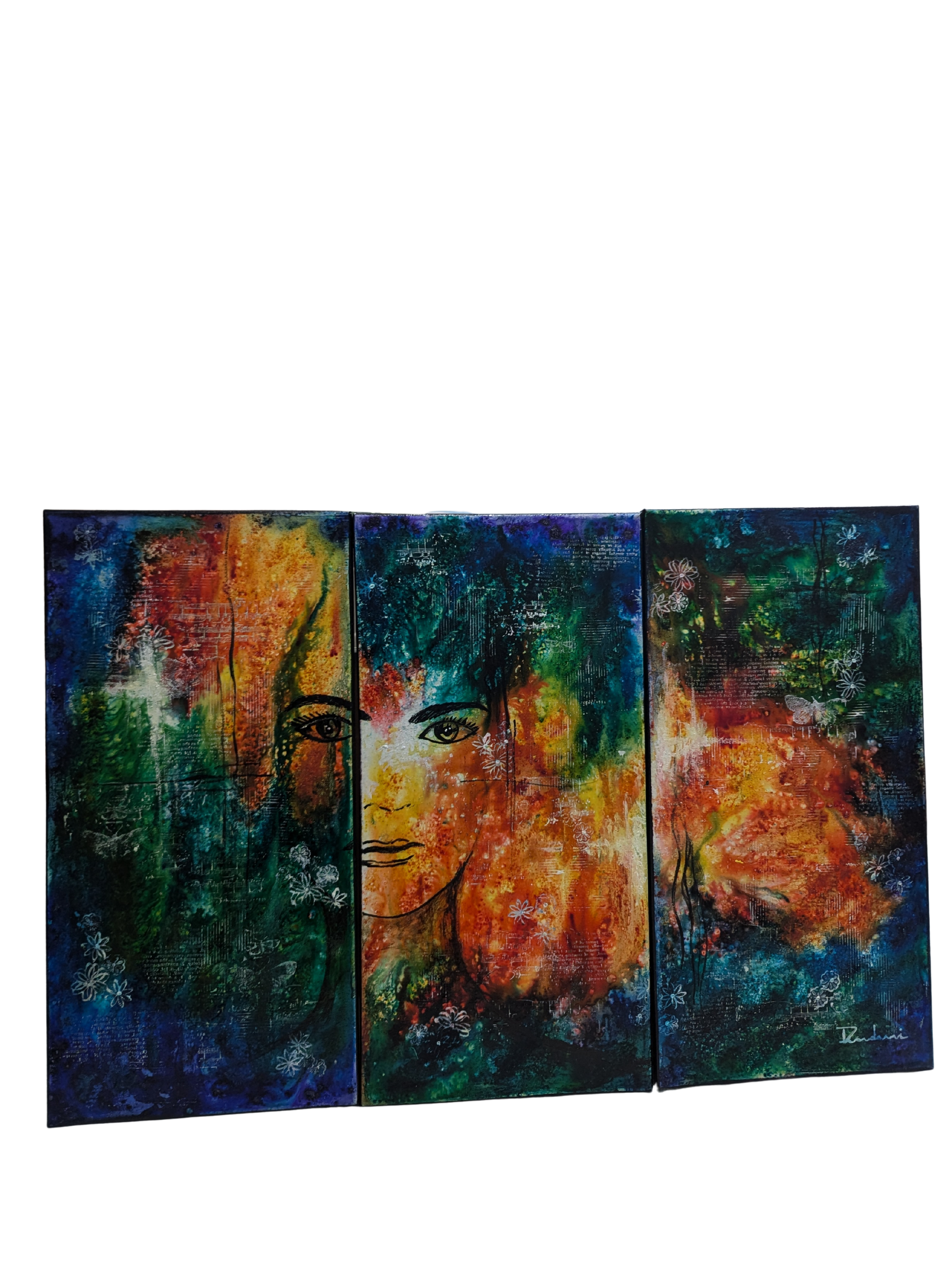 This striking triptych unfolds like a visual hymn to womanhood. Across three panels, a face begins to emerge — neither fully hidden nor entirely revealed — a metaphor for the infinite, layered essence of the feminine. Surrounding her presence are cascades of abstract forms, textured layers, and organic patterns, creating a dialogue between the seen and the unseen, the eternal and the ephemeral. The division of the work into three parts lends it a rhythmic cadence, a reminder of cycles — of nature, of time, of life itself.