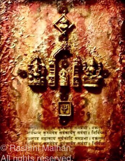 At the heart of the work lies a sacred arrangement of divine figures and ritual symbols. Sculptural statuettes of Hindu deities and temple motifs form the focal point, framed by textured layers of reds, golds, and ochres. Below, a Sanskrit prayer anchors the composition, grounding it in spiritual tradition.