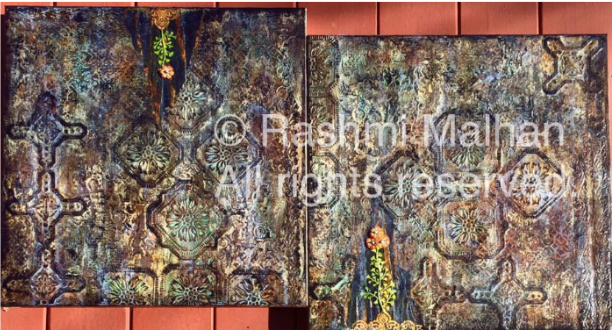The two canvases evoke the aura of ancient ruins, with richly textured surfaces resembling carved stone, weathered walls, and faded patterns. Amidst the cracks and tarnished surfaces, small saplings with delicate blossoms emerge — subtle symbols of resilience and renewal.