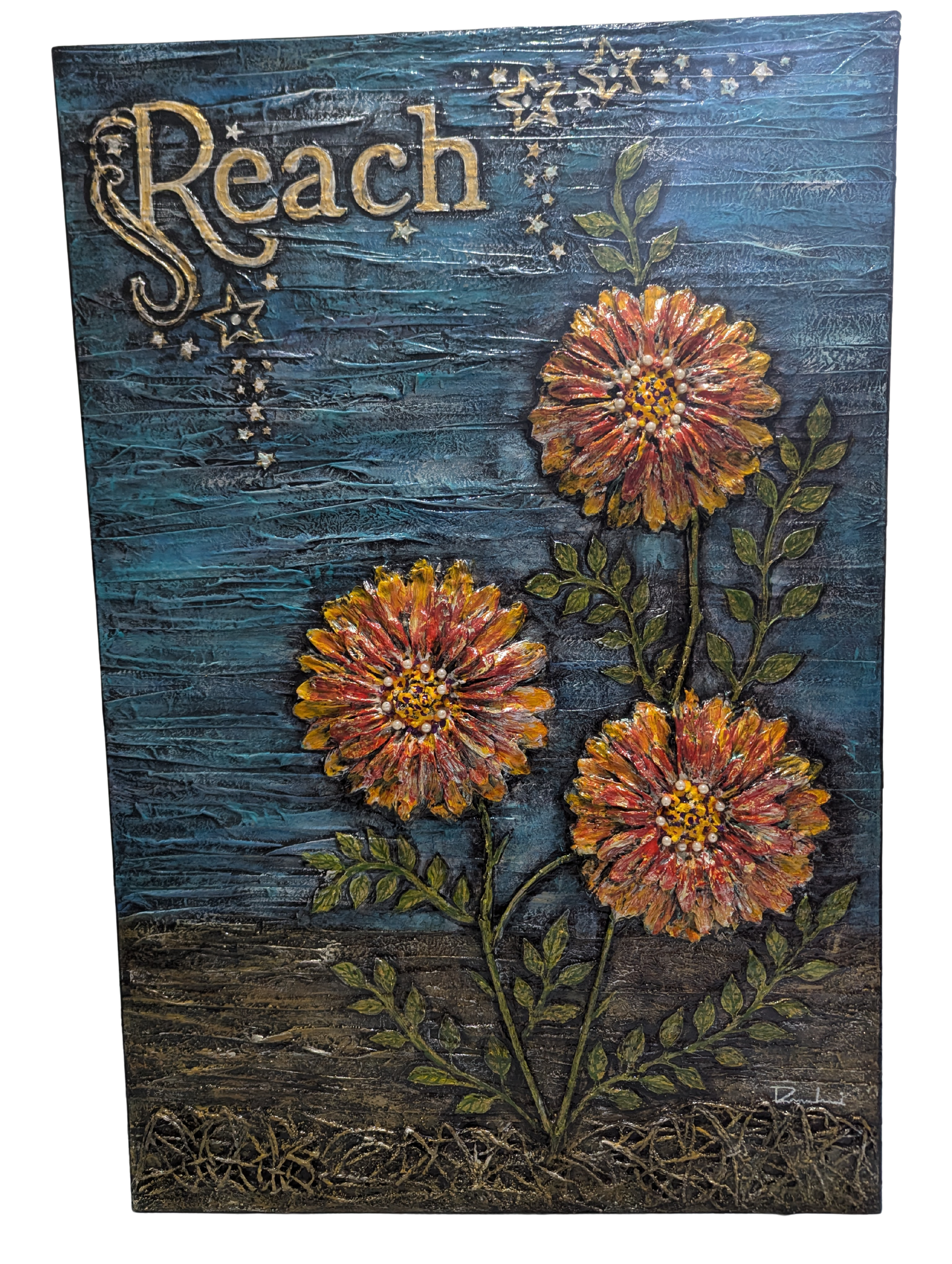 The surface is richly tactile — heavy textural strokes form the strata of soil and the weathered grain of sky, while the blossoms are sculpted with layered paint, giving them dimensionality and presence. Mixed media elements in gold leaf–like accents enhance the word Reach and the celestial motifs, imbuing the piece with a sense of preciousness and permanence.