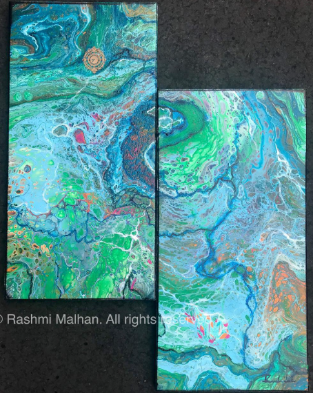 River of Dreams is my meditation on movement, surrender, and the beauty of letting go. Created as a diptych, the two canvases invite you into a shifting current of color — vibrant greens, blues, turquoise, and copper merging and breaking apart like water finding its way. The acrylic pour technique allowed the paint to move with its own will, creating natural ripples, cells, and textures that mirror the spontaneity of a river’s course.
