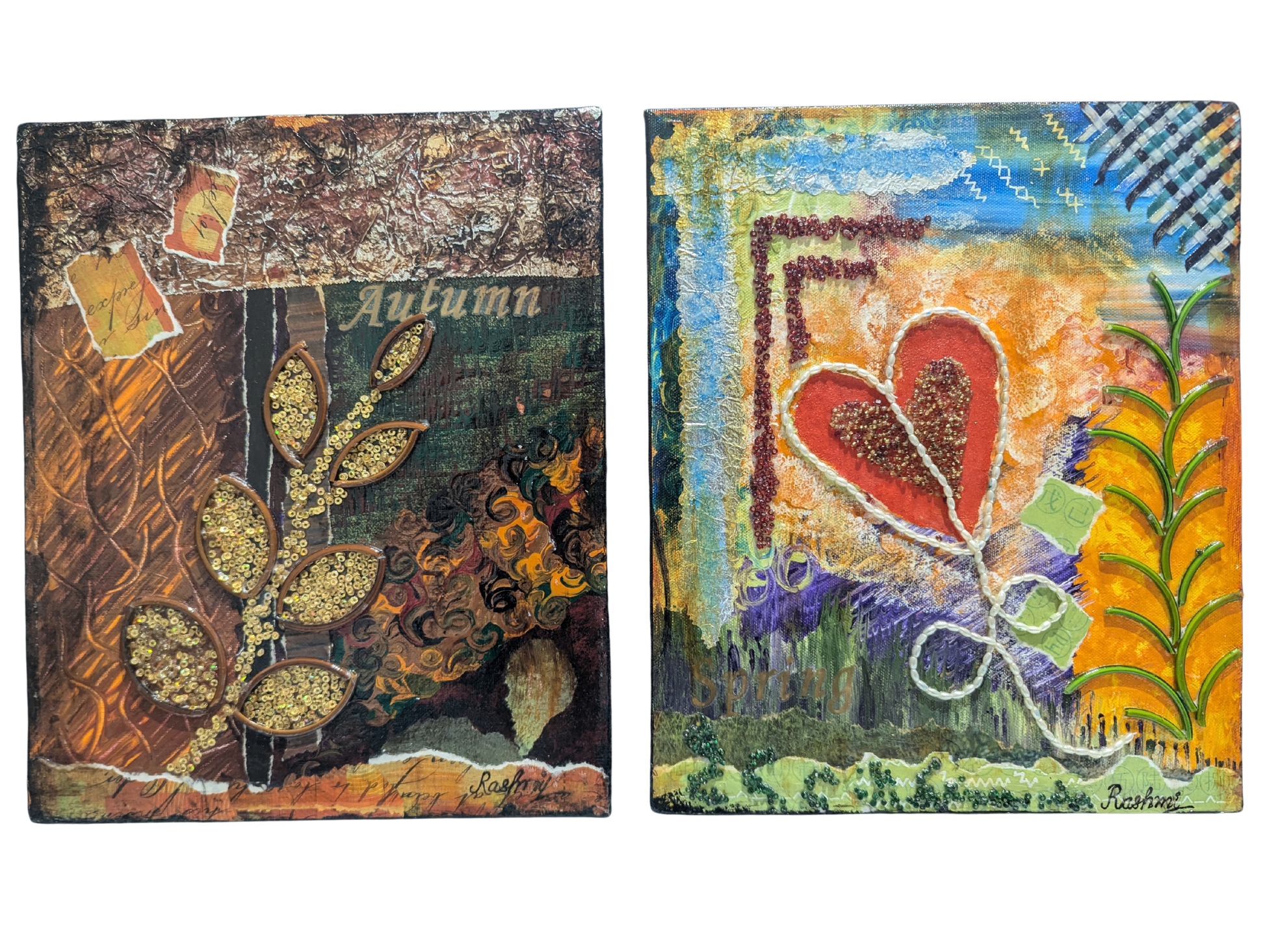 This diptych pairs two seasons — Autumn and Spring — in a tactile exploration of nature’s rhythm. The left canvas glows with warm russet, gold, and burnished tones, anchored by textured leaves and metallic details, evoking crisp air and falling foliage. The right canvas bursts with freshness: vibrant greens, blues, and fiery oranges surround a heart-shaped kite soaring freely, capturing the spirit of renewal and release.