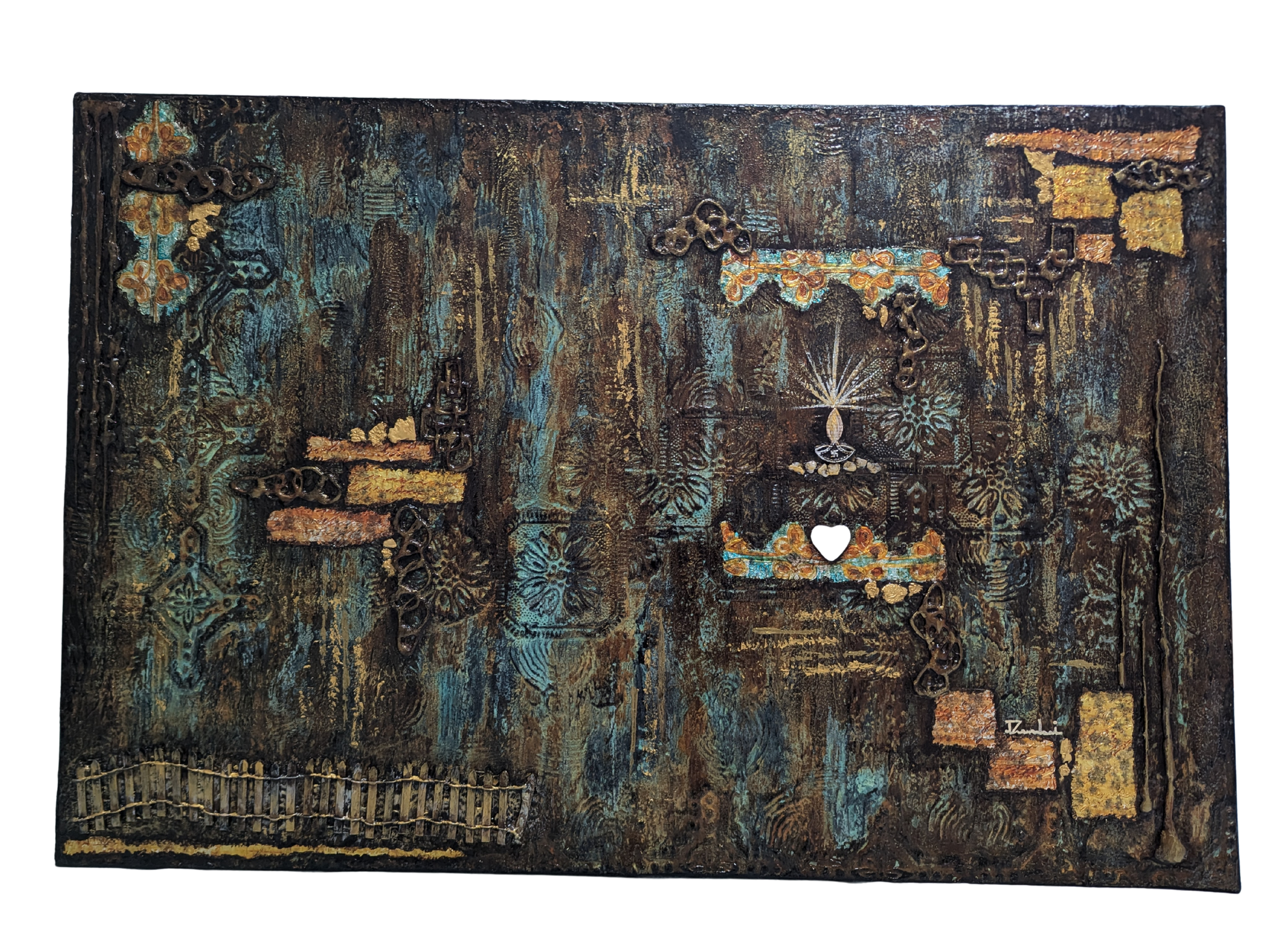 When I painted this piece, I imagined old walls speaking—bearing the imprints of generations, carrying both scars and blessings. The diya at its heart is my offering, a symbol of clarity in the shadows. The foil glimmers as a proxy for divine grace, while the broken fence reminds us of the courage required to dismantle what no longer serves.