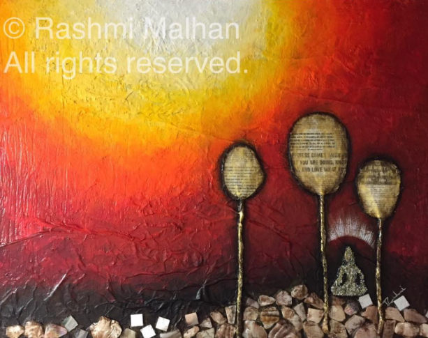 The image of Buddha under the Bodhi tree spoke to me as a timeless symbol of awakening. I chose to render it with rich textures and unconventional materials — rocks, mirrors, and paper — to reflect the fact that wisdom often emerges through challenges, through the roughness of life rather than its ease. The glowing light spreading outward became my way of showing how inner understanding can illuminate even the darkest corners.